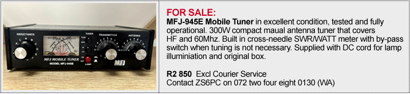MFJ 993 300Watt IntelliTuner working as it should and overall condition 8/10 with Icom cable and manual R3500 excl courier SOLD